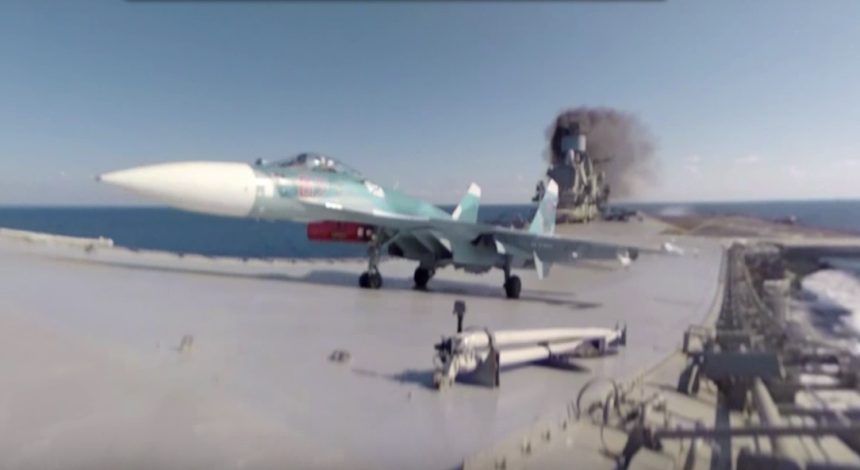 Still, we havenโt seen any clear footage of the aircraft actually taking off from Kuznetsov in that configuration even if it must be said that itโs not easy to spot the bombs carried underneath the fuselage between the air intakes.