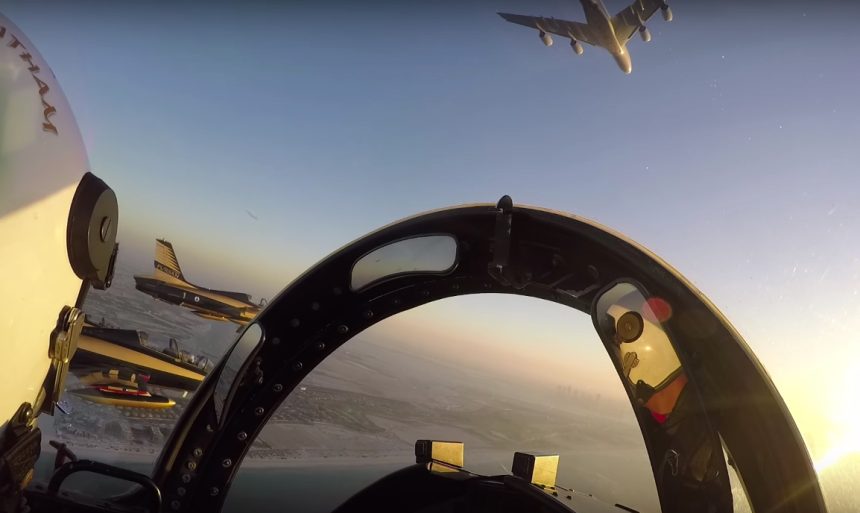 The following footage, filmed from both inside the UAE AF display team jets and the civilian โsuperjumboโ show the amazing pass conducted by the unusual formation at dusk.
