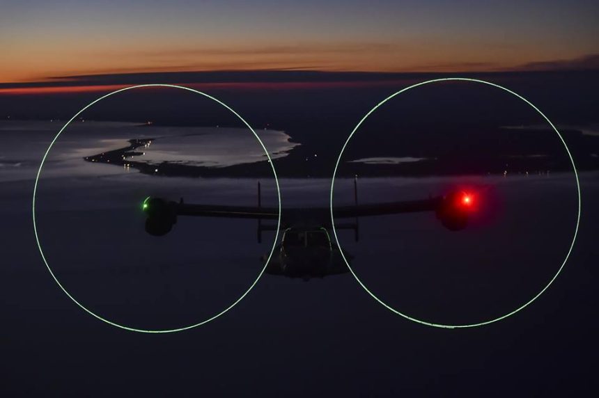 Indeed, to help at night during formation flights as well as on the ground to show personnel the position of the blades and guide them to the safe areas and to the ramp, the tilt-rotor aircraft have two NVG (Night Vision Goggle) compatible dual-mode LED โtip lightsโ on the end of each rotor blade whose brightness can be controlled by the aircrew.