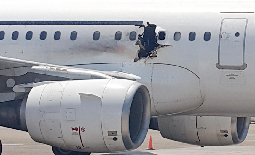 Top image: Damage from a bomb detonated on board Daallo Airlines Flight 159 Over Somalia on February 2, 2016 (credit: GoobjoNews).