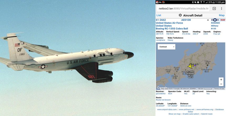 Unsurprisingly, two Cobra Ball aircraftย (61-2662 and 61-2663) are currently deployed to Yokota Air Base, Japan, from where it is launched when there are signs of an imminent North Korean test. What is far more surprising is the fact that, in spite of their important role, RC-135S aircraft are among the military planes that can be tracked online by exploiting the signals broadcast by their Mode S/ADS-B transponders.
