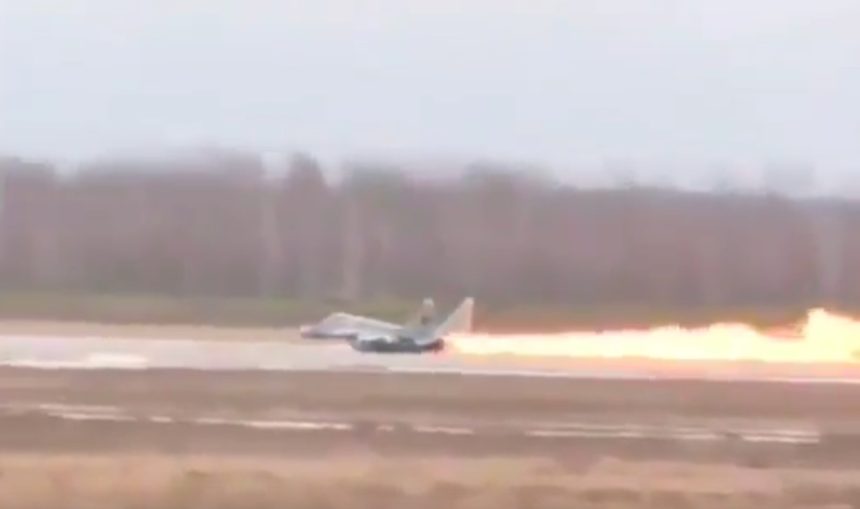 Impressive footage shows a Belarusian Air Force MiG-29’s failed take off and subsequent ejection.