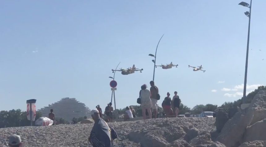The aircraft in the footage below (filmed by Amine Abid) belong to the fleet of the French Sรฉcuritรฉ Civile that operates a fleet of more than a dozen CL-415, a type of amphibious aircraft developed to deliver massive quantities of suppressant in quick response to fires.