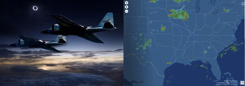 “The two planes, launching from Ellington Field near NASA’s Johnson Space Center in Houston will observe the total eclipse for about three and a half minutes each as they fly over Missouri, Illinois and Tennessee. By flying high in the stratosphere, observations taken with onboard telescopes will avoid looking through the majority of Earth’s atmosphere, greatly improving image quality. At the planes’ cruising altitude of 50,000 feet, the sky is 20-30 times darker than as seen from the ground, and there is much less atmospheric turbulence, allowing fine structures and motions in the Sun’s corona to be visible.