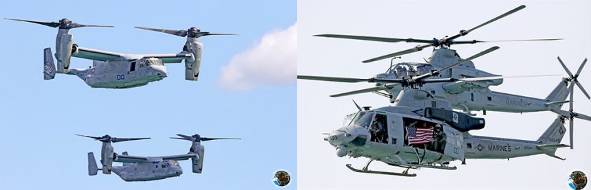 Prior to the extraction of the boarding team a pair of beautiful MV-22 Osprey tiltrotor aircraft from the famous Marine Medium Tiltrotor Squadron 166ย (VMM-166) โSea Elksโ of Miramar Naval Air Station made a flyover while transitioning their proprotors from the vertical, hover orientation to the horizontal flight attitude as they accelerated away from show center.