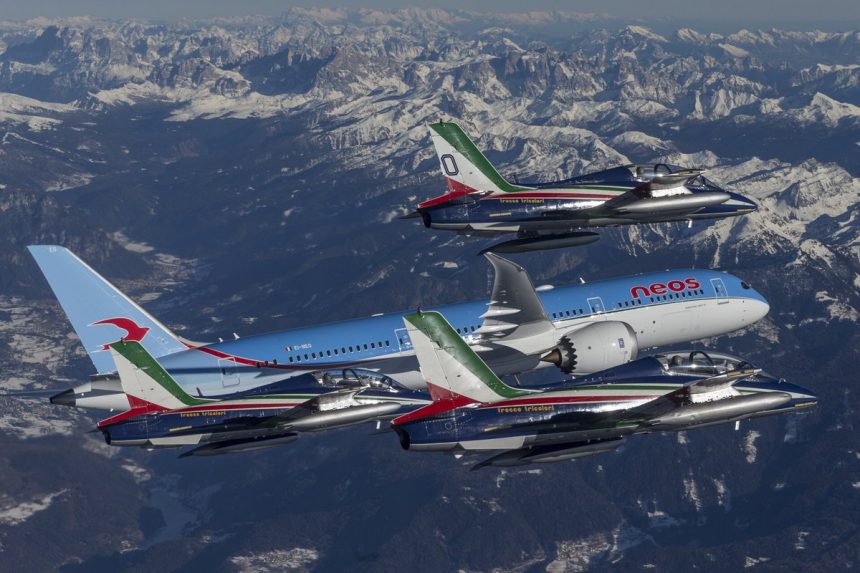 Neos first Boeing B787-9 flew in formation with four MB339PAN of the Frecce Tricolori display team duringย a special flight ahead of the first revenue flight.