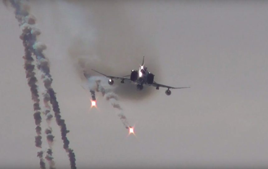 As you can see, the F-4s release plenty of flares while approaching the simulated target, to face possible IR-guided surface-to-air missiles.