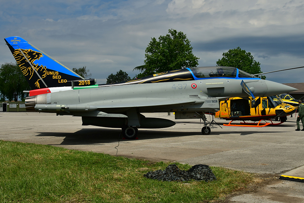 The 20th Gruppo, the Typhoon OCU (Operational Conversion Unit), based at Grosseto and in charge of the training of all the Italian pilots destined to the Eurofighter fleet, presented a special colored two-seat Typhoon: designed by Silvano Mainini and Andrea Scomparin (who are also behind many other famous special colors including two of those presented last year) the TF-2000A MM55168/4-37″ sports the squadronโs black and yellow Lion on a blue background on the right hand side of the tail, the black cat chasing three green mice on a white background (typical of the 51ยฐ Stormo) on the left hand side. The aircraft ‘s upper side of the fuselage, the air brake and the canards are painted as well.