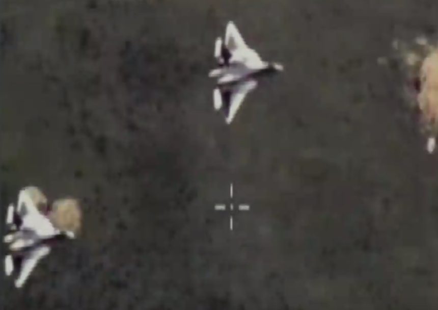 Two Su-57s flying in formation as seen from a drone.