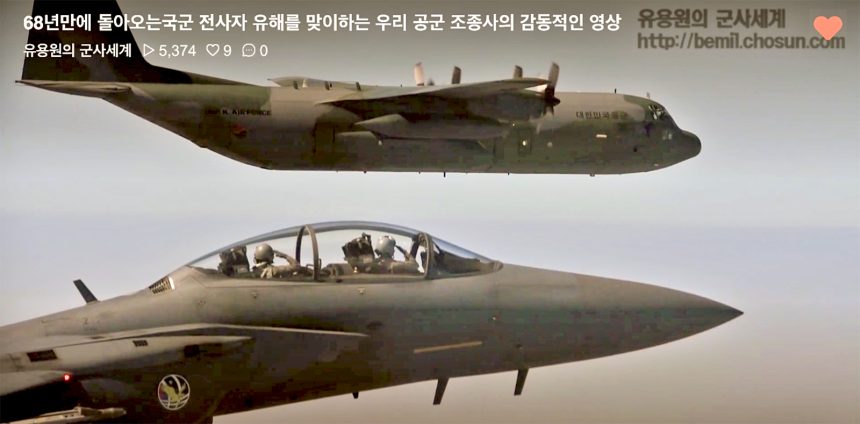 D’Costa managed to find the Korean in-flight newsreel video of a Republic of Korea Air Force (ROKAF) F-15K Slam Eagle of the 11th Fighter Wing from Daegu, South Korea joining other aircraft including FA-50 Fighting Eagles of the 8th Fighter Wing at Wonju, South Korea as they escort the remains flight in a ROKAF C-130H transport.