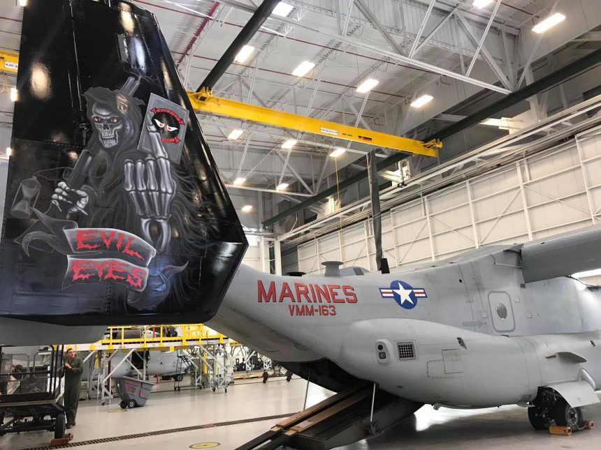 The photographs you can find in this post were taken on Oct. 31, 2018 at Marine Corps Air Station Miramar, California. They show an MV-22 Osprey tilt-rotor aircraft belonging to the Marine Medium Tiltrotor Squadron 163 “Evil Eyes” in a new special color scheme prepared by Shayne Meder, aka Flygirlpainter, a retired Air Force master sergeant from Riverside, California, who’s painted with special liveries some 60 U.S. Navy Seahwaks, U.S. Air Force KC-135, C-17 and C-141 aircraft along with U.S. Marine Corps CH-46 and MV-22.
