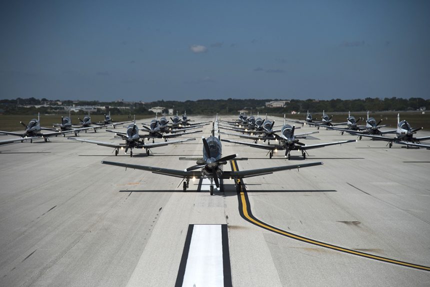 The latest Elephant Walk on the U.S. soil took place on Oct. 26, 2018, when T-6 Texan II single-engine, two-seat turboprop primary trainer aircraft from the 559th Flying Training Squadron and the 39th FTS participated in an “Elephant Walk” at Joint Base San Antonio-Randolph, Texas. Although Elephant Walks are commonly performed as a “show of force,” the Squadron at Randolph conducted one to get in touch with their heritage: both were formed and operated during WWII. The exercise was called a “Goat Trot/Snake Slither” as the 559th are the fighting Billy Goats and the 39th are the Cobras.