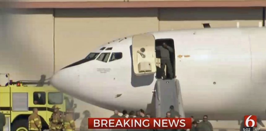 A U.S. Navy E-6B Mercury “Doomsday Plane” made a precautionary landing on Tuesday, March 5, 2019 at Tulsa International Airport at approximately 3:00 PM local. The crew were seen to evacuate the aircraft using the emergency slides. At least one crew member appeared to be covering his face, possibly reacting to smoke in the aircraft.