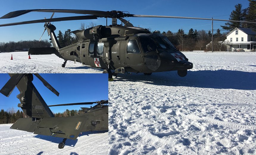According to the Hilltown Community Ambulance Association, emergency services were called shortly before 8PM to respond to an accident that occurred at 07.40PM when a man on a snowmobile crashed into a parked HH-60M helicopter (#12-20499) at a private airfield at Albert Farms, in Worthington, roughly 15 miles west of Northampton. On impact, the snowmobiler went over the starboard side of the elevator and below the main rotor.
