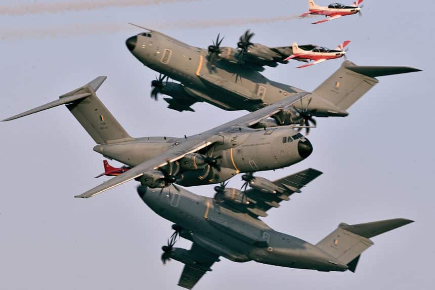 The aircraft pictured include three new Airbus Defense A400M Atlas tactical transports of Malaysia’s 22 Squadron from Subang AFB in Malaysia. Malaysia operates only four of the new A400M aircraft, so this photo represents fully three-quarters of their inventory. The three visible Pilatus PC-7 two-seat, single-engine light turboprop training aircraft are operated by 1 FTC training unit from Alor Setar AFB in Malaysia. The RMAF operates a training inventory of 22 Pilatus PC-7s.