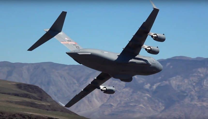 The following video, taken by John Massaro, shows the pass on Apr. 18, 2019. As said it’s not the first time a C-17 cargo aircraft flies through the Jedi Transition, still it’s always interesting to see such a heavy aircraft maneuvering at low altitude through the valleys.