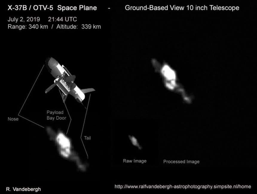 Remarkably, on June 30 and July 2 of this year that Vandebergh finally captured some rare photos of the secret military spacecraft. Fifty-year veteran space journalist and author of the new book, “Moon Rush: The New Space Race”, Leonard David broke the story about Vandeberghโs sighting and photos on Saturday, July 6, 2019 on LiveScience.com. The photos are now being republished and shared around the world.