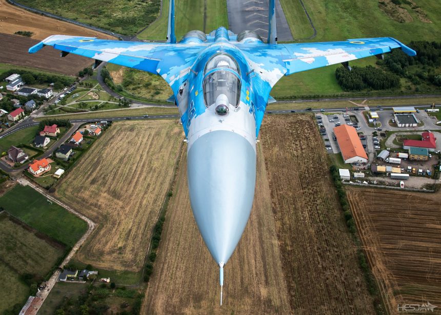 The footage was shot on Aug. 16, after the rehearsals of the LOTOS Gdynia Aerobaltic Airshow, Poland. “Hesja” arranged a join-up of a Ukrainian Air Force Su-27P Flanker with the Skyvan from SKY FORCE Polskie Centrum Spadochronowe.