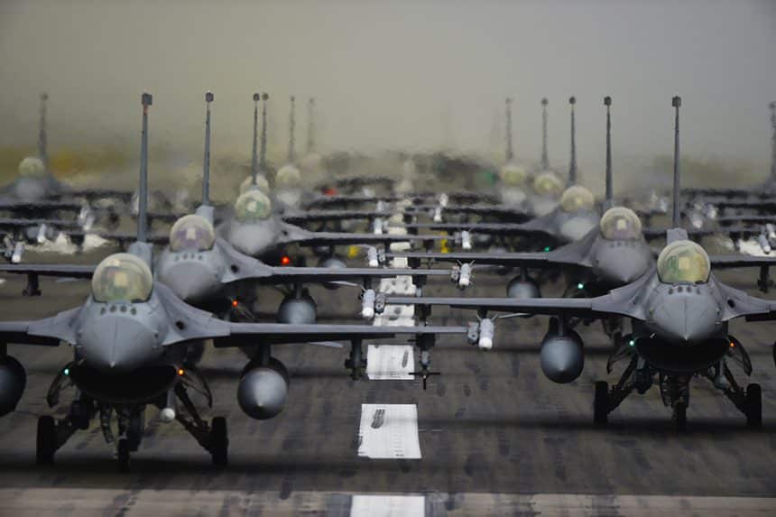 โElephant Walksโ have always been particularly frequent in South Korea where local-based U.S. Air Force jets (often alongside Republic of Korea Air Force planes) often stage such โcollective shows of forceโ in response to North Koreaโs aggressive posture and threats: tens of U.S. F-16s, A-10s and South Koreaโs ROKAF KF-16s regularly taxi down the runway at Kunsan or Osan airbases, in collective โshows of forceโ whose primary aim is to test squadronsโ readiness to war time operations. However, similar exercises are also conducted at airbases in Continental U.S. as happened, for instance, in April 2012, when nearly 70 F-15E Strike Eagles took part to one of the largest Elephant Walk to date at Seymour Johnson Air Force Base, N.C.