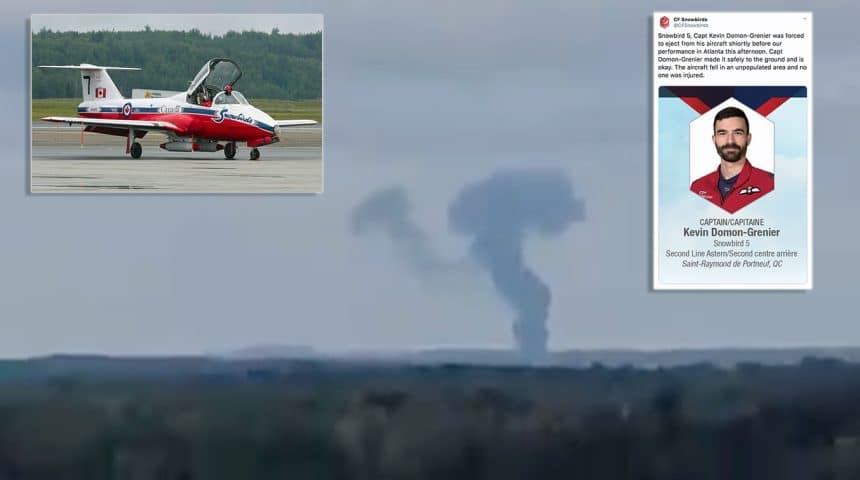 Snowbird 5, Capt Kevin Domon-Grenier was forced to eject from his aircraft shiortly before our performance in Atlanta this afternoon. Capt Domon-Grenier made it safely to the ground and is okay. The aircraft fell in an unpopulated area and no one was injured. pic.twitter.com/Sz1e8EVyE5