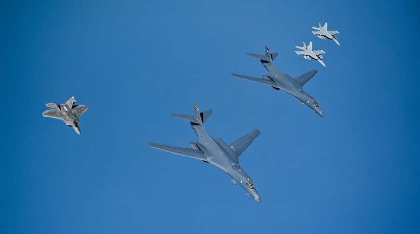 USAFCENT published a series of aerial photographs of the Lancers taking fuel over the Persian Gulf as well as being escorted by the F-22 Raptors and EA-18G Growlers.