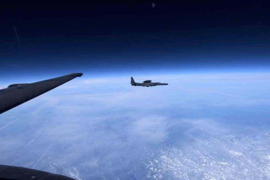 Indeed, images of U-2s flying at very high altitude are quite rare: you can find some shots taken from the cockpit of a lonely Dragon Lady (as the terrific photos we published last year); you can find some images of the spyplane intercepted by a camera ship at lower altitude, but you’ll hardly find pictures taken from a photo ship that show the iconic aircraft at work at FL600+.