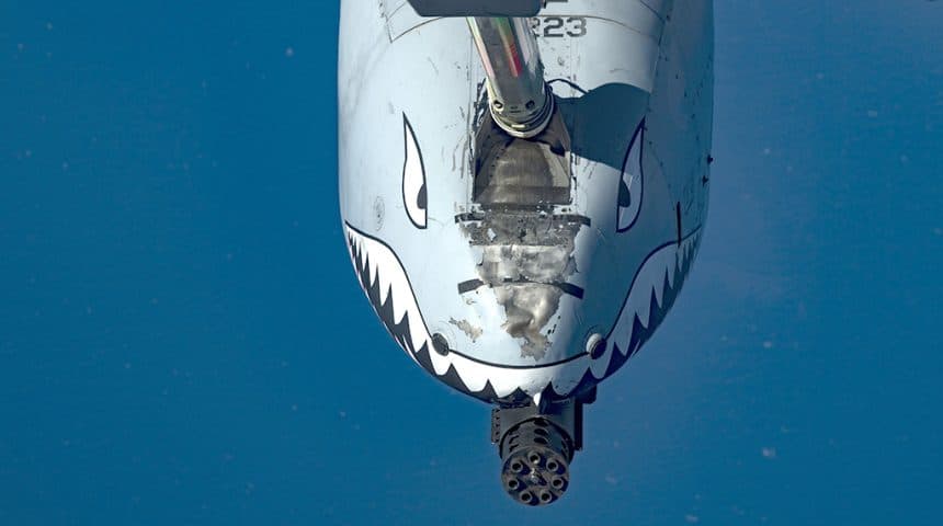 By the way, as mentioned above, the A-10 pictured above was flying in the CENTCOM AOR, where the Warthogs carry out on-call CAS (Close Air Support) and BAI (Battlefield Air Interdiction) missions in support of Operation Inherent Resolve, flying with a mix of missiles, guided bombs and rockets, that complement the A-10โs iconic GAU-8 Avenger 30-mm hydraulically driven seven-barrel Gatling-type gun.