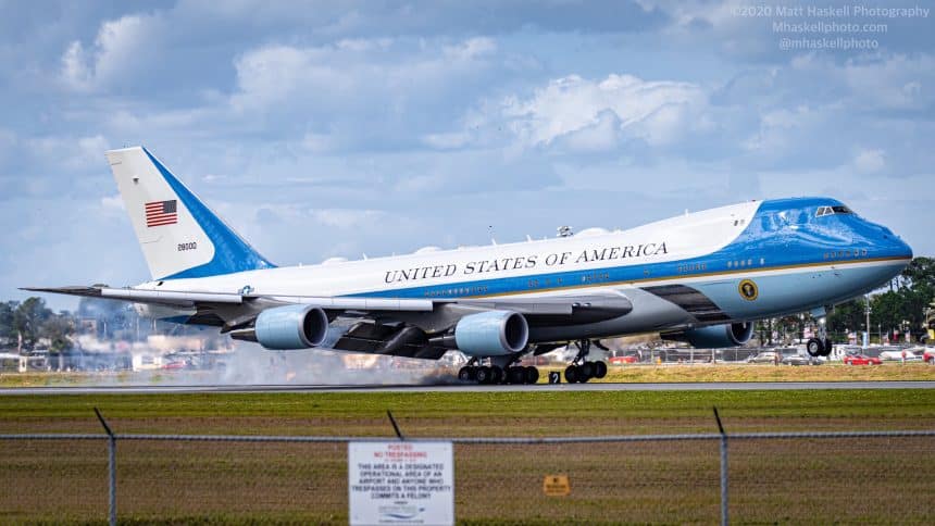 It was a uniquely American moment: the USAF Boeing VC-25A of the 89th Airlift Wing, Presidential Airlift Group (PAG) from Andrews AFB in Maryland with U.S. President Donald Trump on board and flying as โAir Force Oneโ, the callsign when the President is on board the aircraft, performed a flyover (that was filmed from above) and landed at Daytona Beach International Airport next to Daytona International Speedway in Florida, on Feb. 16, 2020.