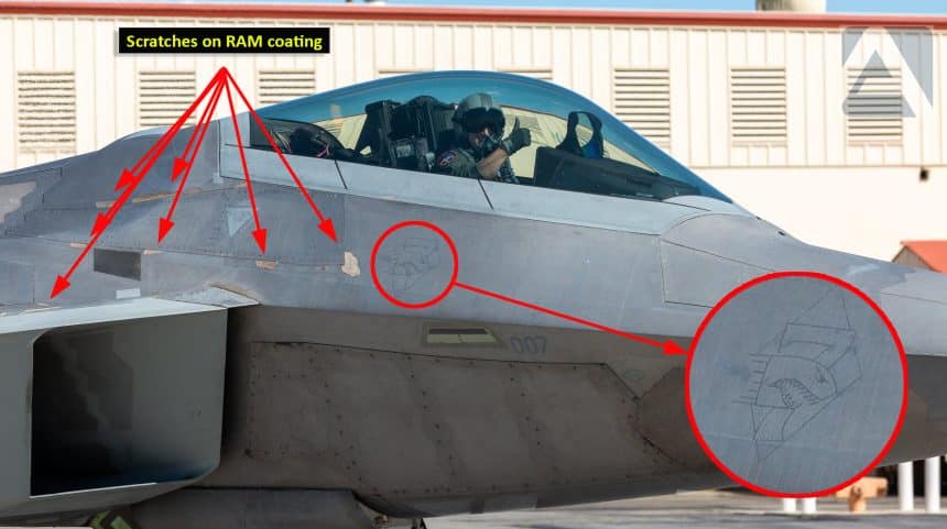 The image of the F-22 released by the USAF with highlighted scratches and nose art. (Image credit: The Aviationist)