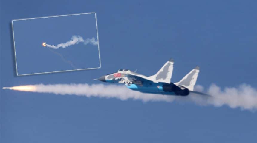 Additionally, other than the missile’s smoke trail, photos show another smoke trail which seem departing from the ground, so we can assume that some kind of target was launched from the ground and not dropped by another aircraft like in some western air-to-air exercises where a first aircraft drops illumination flares to provide a target for the second aircraft that will then fire its IR guided missile.