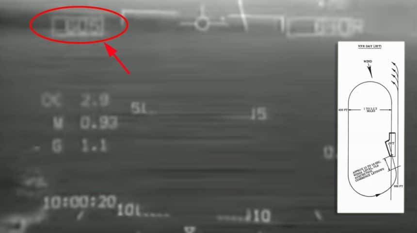 “Entry to the break shall be made at 800 feet. All breaks shall be level. Let down to 600 feet shall commence when established downwind. Descent to these altitudes shall be completed before reaching the 180ยฐ position. From launch, bolter, or touch and go, corrections to parallel the BRC shall not be attempted until a definite climb has been established. Climb to pattern altitude should normally be completed prior to commencing the turn to the downwind leg. Normal interval shall be taken on other aircraft in the pattern,” says the NATOPS Manual.