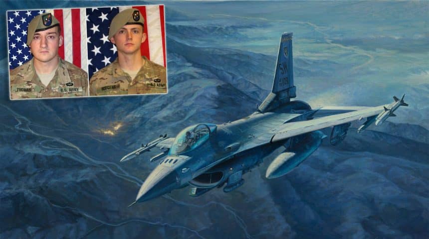 The Rangers called on a pair of U.S. Air Force F-16s from the 79th Fighter Squadron, the โTigersโ, for support. What the pilots initially heard was so chaotic it was difficult to achieve accurate situational awareness of the massed firefight evolving in the dark valley below them. But the two F-16 pilots, Capts. John J. Nygard and Salvador A. Cruz, were able to conduct precision air strikes that broke the back of the enemy resistance and enabled the evacuation of Rangers Sgt. Josh Rodgers and Sgt. Cameron Thomas before they died. Thanks to the heroic flying of Capt. Nygard and Capt. Cruz, the two Rangers would not die in enemy hands.