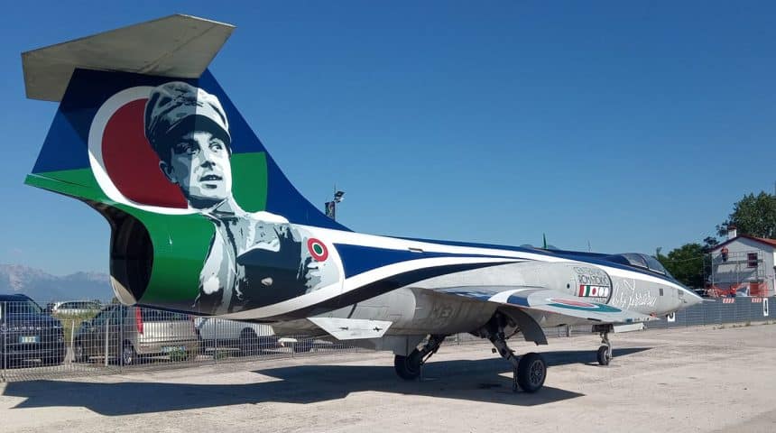 At the same airfield, a few days before the anniversary of the flightโs arrival in Tokyo on May 31, a new special colored F-104 was unveiled, showing a paint scheme like the one of the S.208s but extended also to the fuselage and wings. The differences are that this time there is a bigger portrait of the pilot on the tail and his signature and the anniversaryโs logo have been moved to the forward fuselage and the engine intakes, respectively. Although initially thought to be the F-104S ASA/M, serial MM6914, according to aviation photographer Claudio Toselli, who took the shots that you can see in this post, the right serial is MM6733, a Starfighter previously preserved on a pole at Thiene.