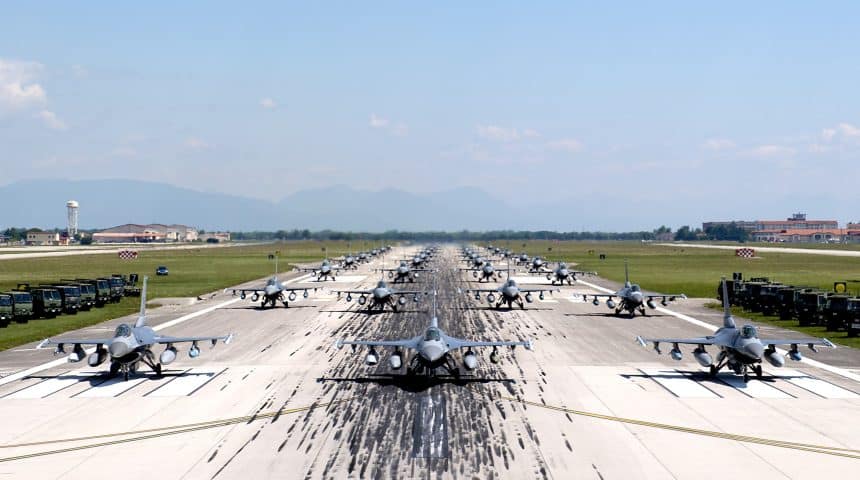 Two dozen F-16s belonging to the 510th Fighter Squadron and 555th Fighter Squadron, along with two HH-60G Pave Hawk helicopters of the 56th Rescue Squadron (plus one acting as a camera ship) took part in an unprecedented 31st Fighter Wing’s “Elephant Walk” on the runway at Aviano Air Base in northeastern Italy.