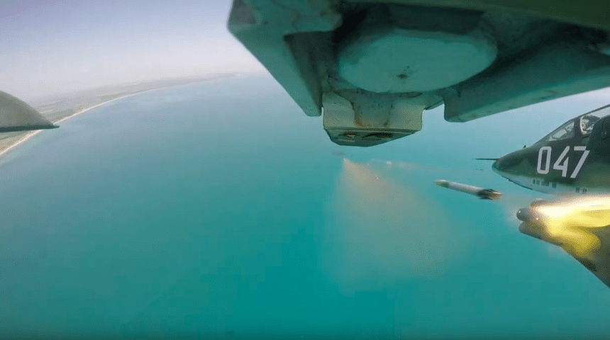 Among the material released by the Bulgarian Air Force, one video is really worth a look. Filmed with a camera attached to one of underwing pylons, it shows a sortie at the sea range by a Su-25UBK Frogfoot attack aircraft carrying UB-32A rocket pods for S-5 rockets.