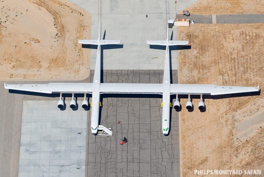 While it waits to resume flight testing, the massive aircraft was photographed from the air at its base in Mojave. On Jul. 24, 2020, Boneyard Safari‘s Dylan Phelps was out for a photoshoot of the final landing of a Qantas 747 being retired, when he spotted that the Stratolaunch Carrier Aircraft had been rolled out into the California.
