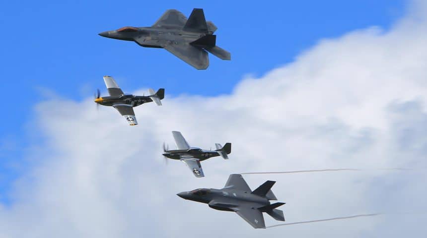 The New York International Air Show was held at Orange County Airport in New York last week end. The air show was held in a “drive in” format with thousands of cars, filled with people in attendance. The highlights included the F-22 Raptor Demonstration Team, the F-35A Lightning II Demonstration Team, the USAF Heritage Flight, and the USAF Thunderbirds. The show was cancelled on Saturday, Aug. 29, due to inclement weather, which left Sunday Aug. 30, to be the main show day, when spectators were treated with a surprise that couldnโt be matched: the USAF Heritage Flight was a true representation of the “American dream”.