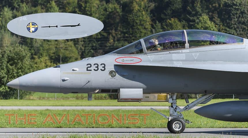 Interestingly, some time after the test, the two seater, J-5033, was given some special markings for deployment: the badge of the 2018 campaign along with the silhouettes of an AMRAAM and a FireJet target drone appear between the canopy and the LERX (Leading Edge Root Extension) in the nose section of the jet. The Aviationistโs contributor Alessandro Fucito took the photos of the aircraft last week at Meiringen Air Base.