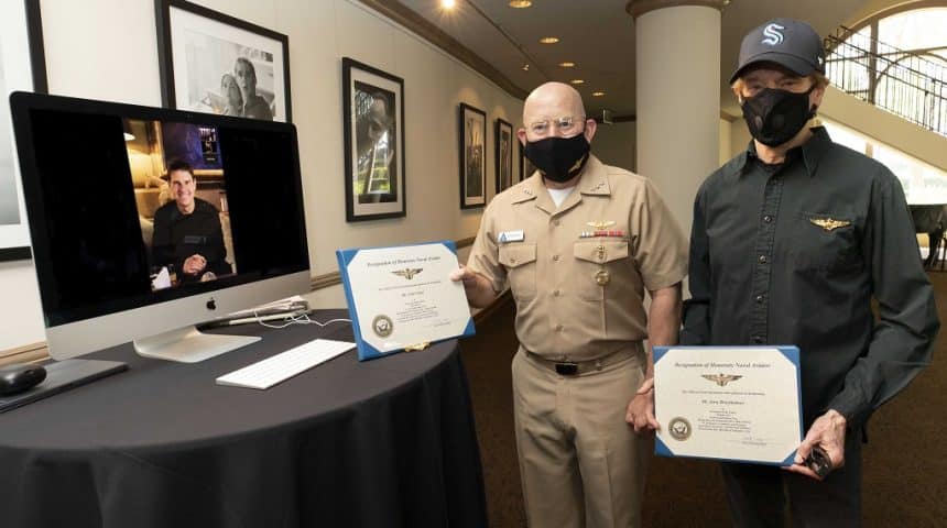 Tom Cruise and Jerry Bruckheimer, respectively leading actor and producer of the Top Gun films, were awarded the title of U.S. Navy Honorary Naval Aviators by the Commander of Naval Air Forces, Vice Adm. DeWolfe Miller III, during a ceremony held at Paramount Studios in Los Angeles on September 24, 2020.
