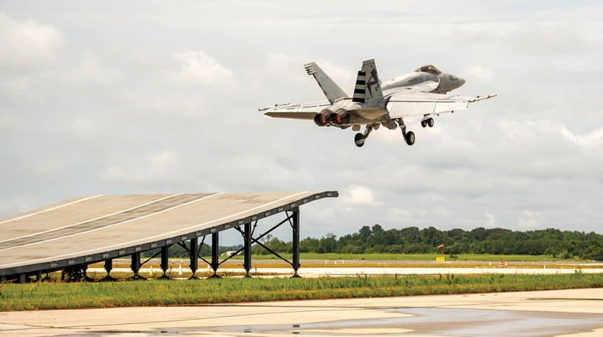 Interestingly this wasn’t the first time a Hornet carried out ski jump take offs. An Air Force Systems Command, dated 1991, says that between 1982 and 1986 “a metal ramp was constructed that could be modified to give ramp exit angles of 3, 6, and 9 degrees. The ramp was 112.1 feet long and 8.58 feet high at ‘he exit when configured for the 9 degree exit angle, measured from the horizontal. A total of 112 launches of the T-2C, 28 of the F-14, and 91 of the F/A-18 were made. The minimum ground roll for the F/A-18 was 385 feet at a gross weight of 32,800 lbs. This ramp effectively reduced the takeoff roll of the F-18 by more than 50 percent.”