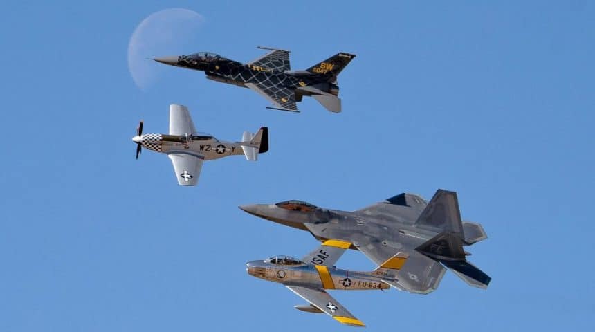 The active duty element of the course consisted of the Air Forceโs four single ship Flight Demonstration Teams respectively flying the A-10C Thunderbolt, F-16CM Viper, F-22A Raptor and F-35A Lightning II. The civilian heritage warbird participants included: five P-51D Mustangs, a P-40N Warhawk, a P-38M Lightning, a P-47D Thunderbolt, an A-1 Skyraider, and a F-86F Sabre.
