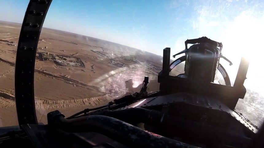 Something interesting can be seen at the 01:56 mark of the clip as one F-15E can be seen performing a low pass over a military base in Syria, identified as being al-Tanf garrison, located in a remote desert outpost in southern Syria near the Jordanian border.