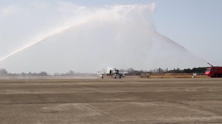The three Samurai Phantoms (two F-4EJ and an F-4EJ “Kai”) took off at around 8:55 AM LT, and flew for about 40 minutes. Then they performed several passes over the base before landing for the last time. After landing, they passed through the water arch by the water cannon and were greeted by the JASDF personnel gathered on the apron with an applause.