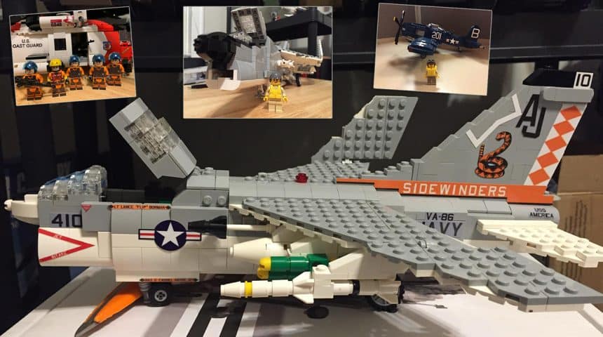 F-14 Tomcat, F/A-18 Hornet, A-6 Intruder, A-7 Corsair and many more types, all done in LEGO bricks.