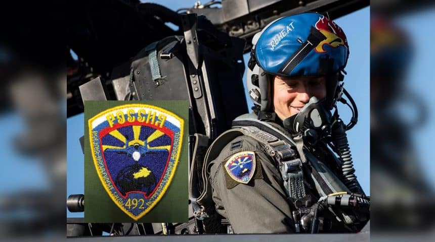 The shield-shaped patch shows a Russian-made Su-27 Flanker on a blue background with a Russian flag and the Cyrillic writing “Russia” on the top and the number “492” on the bottom, closely resembling the insignia of the now deactivated 611th Fighter Aviation Regiment of the Russian Aerospace Forces.
