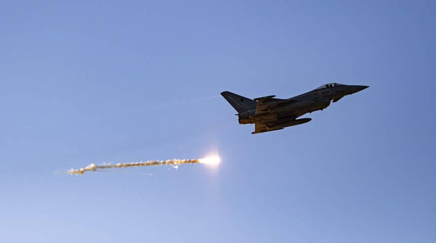 While over the range, the Eurofighters popped flares: while normal in a real operational environment, it’s not that usual to see a Typhoon (even more so, an Italian F-2000) using flares, i.e. high-temperature heat sources used to mislead surface-to-air or air-to-air missileโs heat-seeking targeting systems, creating the pyrotechnic visual effect similar to a fireworks display. Such countermeasures are used against MANPADS (Man Portable Air Defense Systems)ย andย IR-guided surface-to-air missiles.