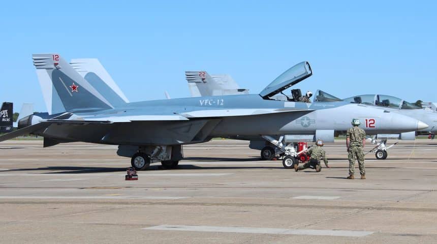 A U.S. Navy F/A-18E Super Hornet “Red 12”, belonging to Fighter Squadron Composite Twelve (VFC-12), the โFighting Omarsโ, based at Naval Air Station Oceana in Virginia Beach, Virginia, has been given a paint scheme with a paint scheme that features the profile of a Russian Air Force Su-57 Felon.