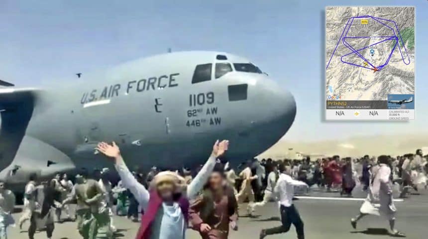 Flight tracking websites showed (and continue to show – although many have been operating with their Mode-S transponder turned off) a number of U.S. Air Force C-17A Globemaster III and KC-135R Stratotanker aircraft flying out of the region. The KC-135R tankers might be providing fuel once airborne to overloaded C-17As that may have been forced to take off with lighter than normal fuel loads to carry more people on board. The C-17A Globemaster III can be specially configured with sidewall and center seating with 9 seat pallets that will make room for, โup to 188 passengersโ.