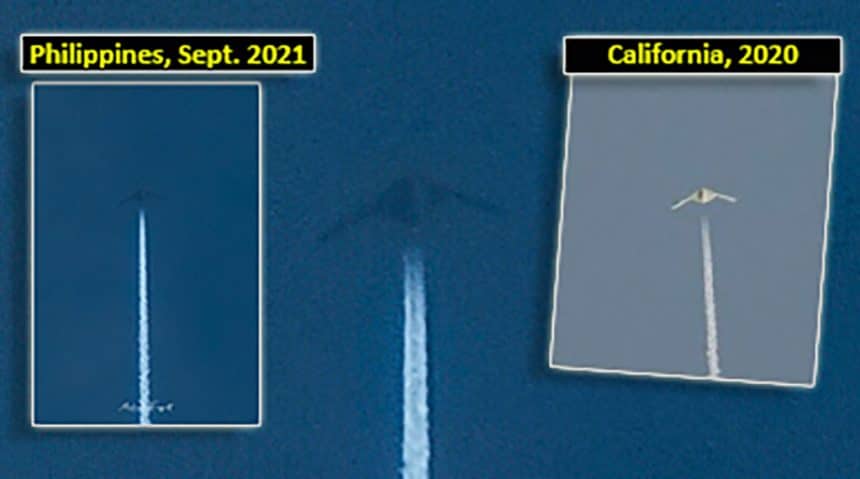 The shot features what seems to be a large-span flying wing with straight trailing edge and trails two contrails, suggesting closely paired twin turbofan engines: in other words, the one photographed over the Philippines a few days ago appears to be strikingly similar to the mysterious UAS (Unmanned Aircraft System) spotted flying over Palmdale, California, in 2020, a UAS thought to be a ย either the highly classified Northrop Grumman RQ-180 drone, or a Lockheed Martin P-175 Polecat derivative.