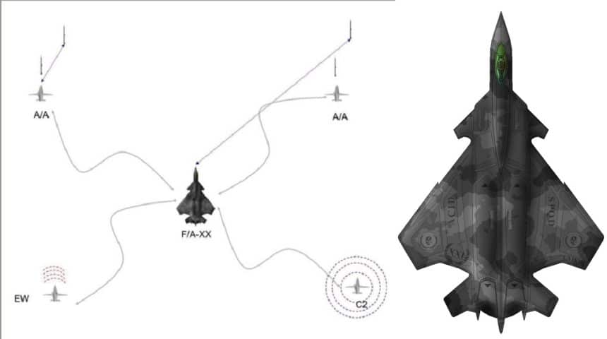 The image shared by the Navy also shows the F/A-XX operating in a MUM-T environment with four drones, whose shape represents the MQ-25. Interestingly, the drones are shown employing Air-to-Air (AA), Electronic Warfare (EW) and Command and Control (C2) payloads, much like the Loyal Wingman drones currently being developed. This falls in line with the service envisioning Unmanned Air Systems (UAS) to fill refueling, communications relay, logistics, airborne electronic attack, strike, and ISR&T missions in the future air wing.